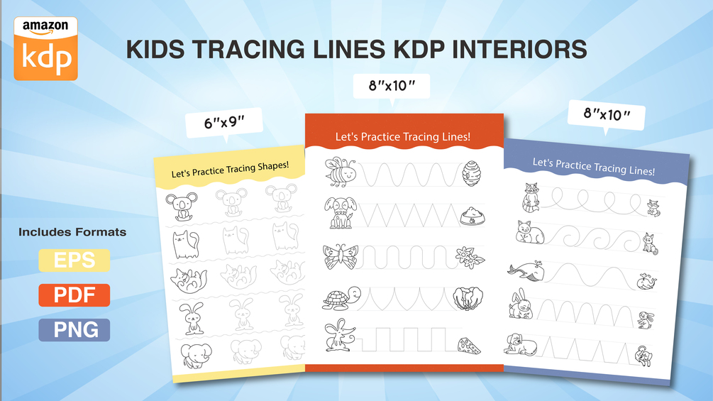 You'll get a zip file includes 3 Shapes & lines Tracing Pages For Kids 4-8 - In size 6x9 - 8x10 -8.5x11 - Kdp Interior Ready To Print – Eps - Pdf - Png