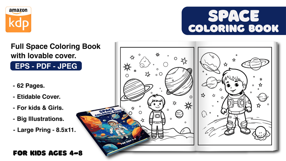 You'll get a full space coloring book with lovable cover ready to print for kdp - Eps - Pdf - Jpeg - 8.5x11