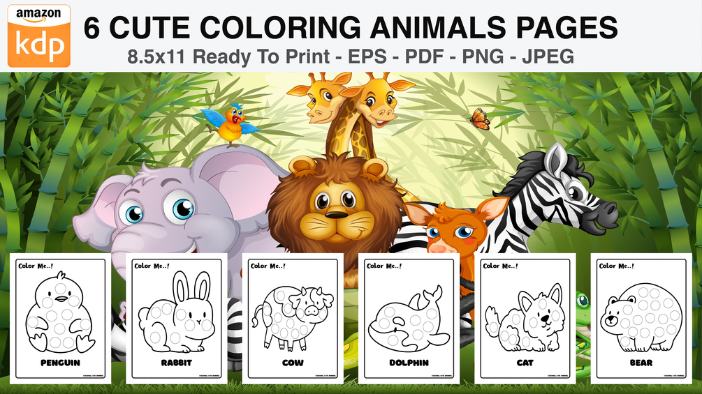 You'll get 6 Cute Coloring Animals Pages For Kdp Ready To Print – 8.5x11 - Eps - Pdf - Jpeg - Png .